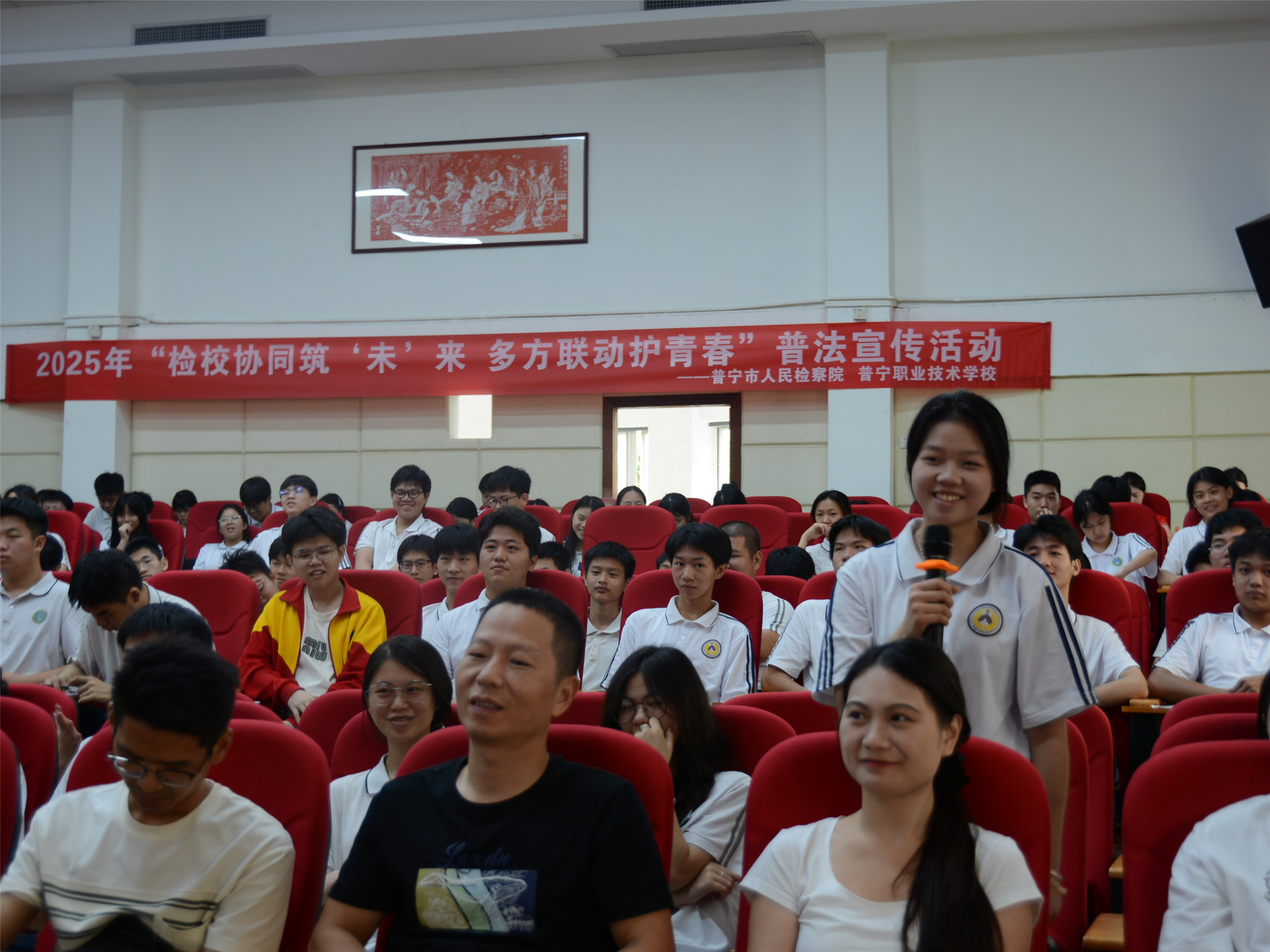 本次“反电诈”系列法治课,以近期火爆的“拉布布”热捧现象为引生动开讲,通过案情代入、播放“AI”模拟人物视频等方式“见招拆招”,拆解了“0元购”、“高薪招聘”、“零门槛开店”等与职校生息息相关的常见求职骗局,讲授了“勿要贪图小利,警惕陌生链接,提高技术防范,保护个人信息安全,遇诈迅速报警”等实用防诈小知识。同时,普宁市院延展履职触角,通过“副检察长担任法治副校长”“多方座谈研讨”“设摊咨询互动”同步、多维传递法治观念。轻松活跃的课堂气氛、丰富多元的活动形式、干货满满的普法内容获得人大代表、政协委员、老师和广大学生的一致赞誉,各方对本次活动均给予了充分肯定。