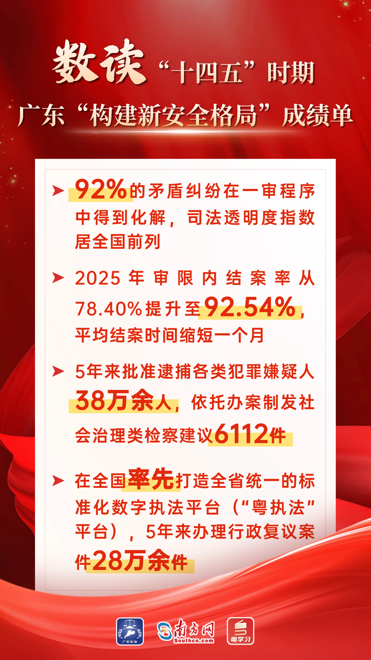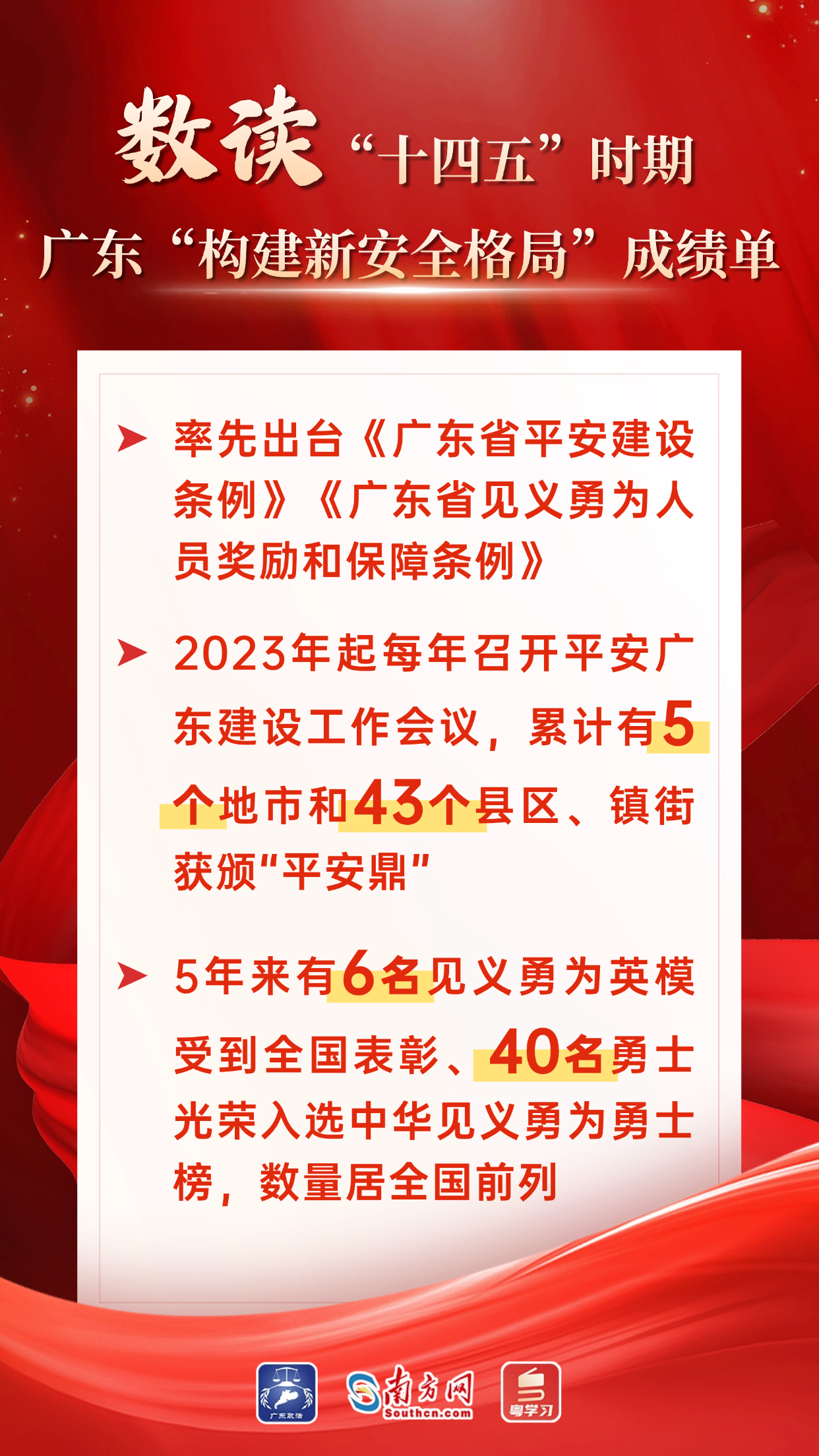 “十四五”时期,广东坚决贯彻党中央决策部署,将“扎实推进法治广东平安广东建设,在构建新安全格局上取得新突破”纳入省委“1310”具体部署,奋力打造全国最安全稳定、最公平公正、法治环境最好的地区之一。“十四五”平安广东建设规划圆满完成,交出了一份亮丽的“平安答卷”。下面,让我们用一组海报,“数读”广东这份硕果累累的成绩单。