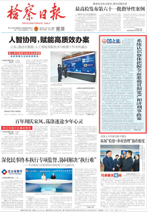 “宽以济猛,猛以济宽,政是以和。”全面准确贯彻宽严相济刑事政策事关国家长治久安、人民安居乐业。各级检察机关要深刻认识宽严相济刑事政策的重要作用,准确把握内涵要求,始终坚持以习近平法治思想为根本遵循,全力履行国家法律监督机关职责,推动宽严相济刑事政策得到全面准确贯彻,更好运用法治力量支撑和服务中国式现代化。