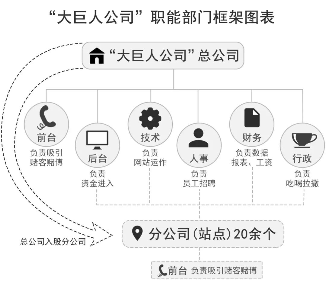 2016年初,因国内对网络赌博持续打击整治,黄某法将公司转移到柬埔寨,命名为“大巨人公司”,并借助国外宽松的博彩政策逐步发展壮大,成为由4个主网站加25个子网站组成的庞大赌博集团。考虑到运营成本问题,2018年,他又将部分站点和业务迁至菲律宾。