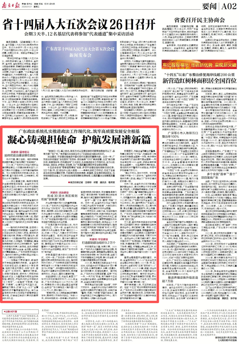潮平岸阔催人进,风正扬帆正当时。站在“十五五”规划开局起步的新起点,广东政法系统将更好统筹发展和安全两件大事,增创新优势、实现新突破,为广东在推进中国式现代化建设中走在前列贡献更多政法力量。