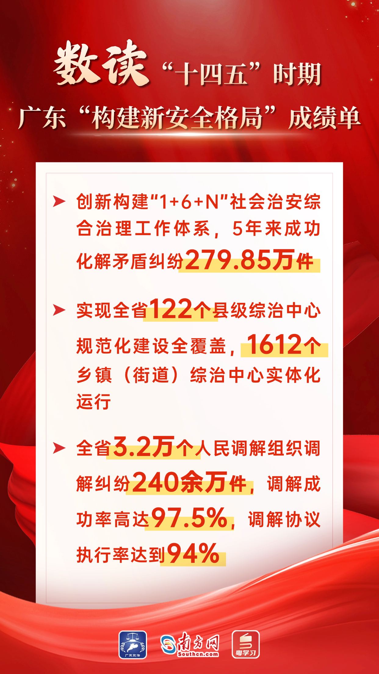 “十四五”时期,广东坚决贯彻党中央决策部署,将“扎实推进法治广东平安广东建设,在构建新安全格局上取得新突破”纳入省委“1310”具体部署,奋力打造全国最安全稳定、最公平公正、法治环境最好的地区之一。“十四五”平安广东建设规划圆满完成,交出了一份亮丽的“平安答卷”。下面,让我们用一组海报,“数读”广东这份硕果累累的成绩单。